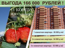Весь июнь от застройщика «Гефест» будет действовать специальное предложение, согласно которому приобрести квартиру в 11-м корпусе жилого комплекса «Супонево» можно будет с выгодой в размере 166 тыс. рублей. Так, стоимость одного квадратного метра 1-комнатной квартиры составит 56 тыс. рублей, 2-комнатной – 54 тыс. рублей, 3-комнатной – 53 тыс. рублей.